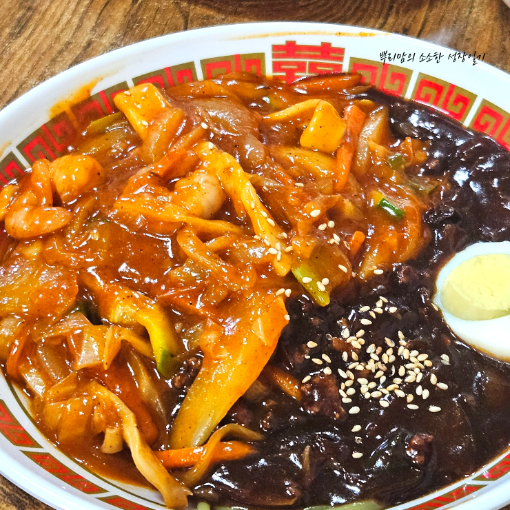 - 검은 짜장 소스 + 붉은 사천양념이 반반 섞여 있음
