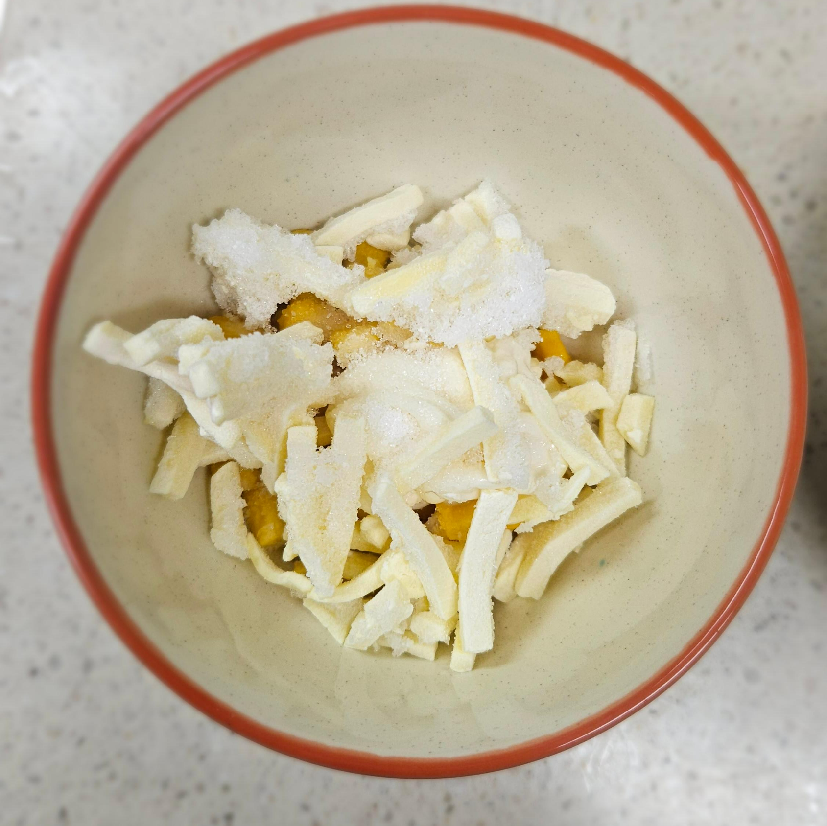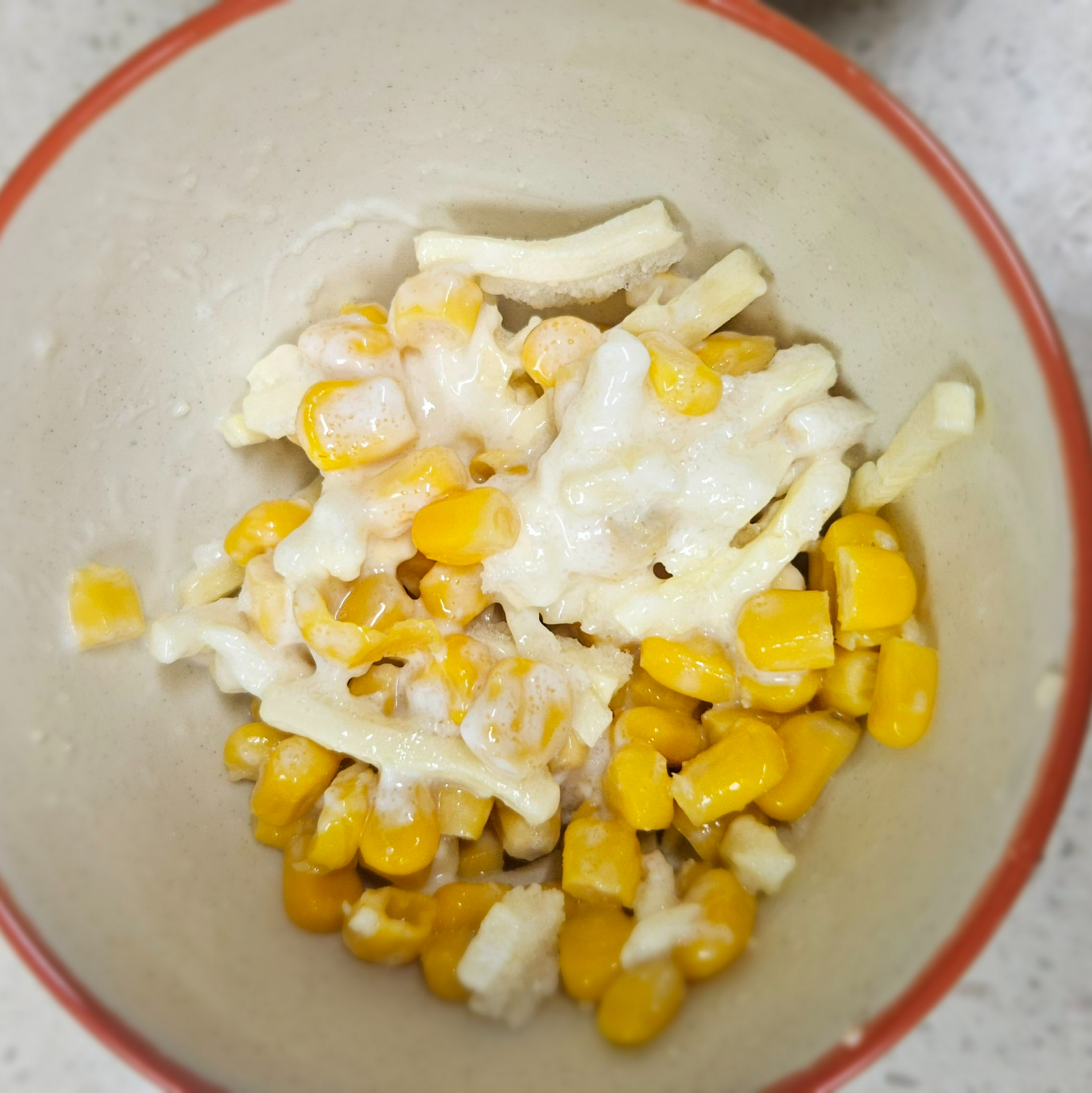 옥수수콘 2t, 설탕1t, 마요네즈1.5t, 모차렐라 치즈1t 넣고 잘 섞어줍니다.
