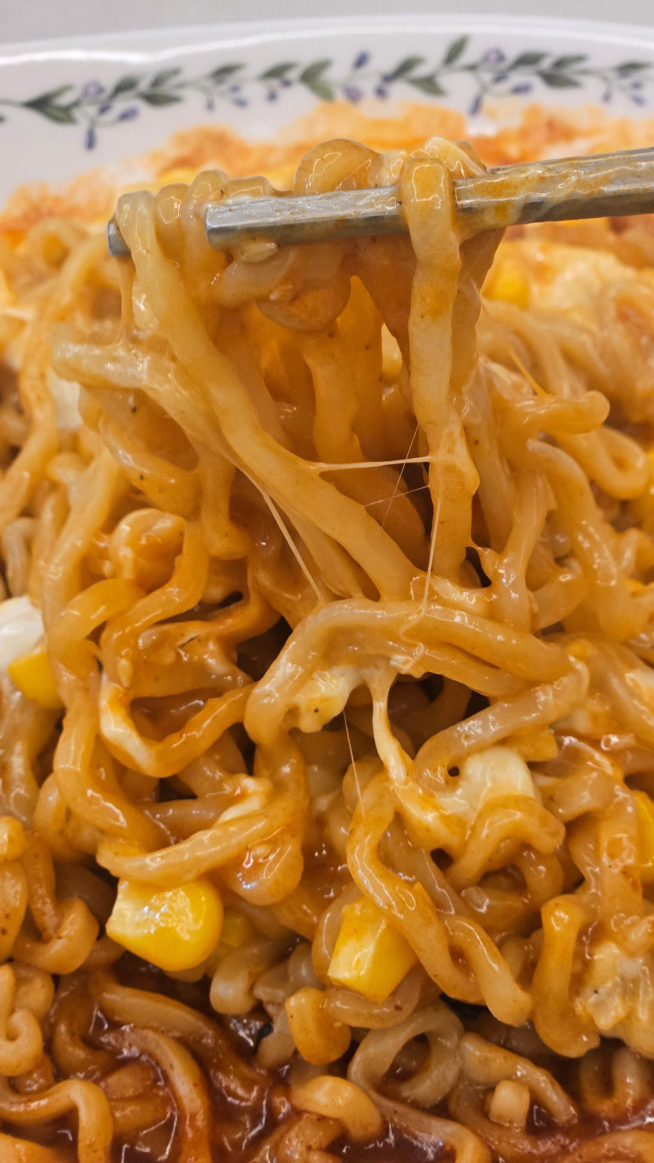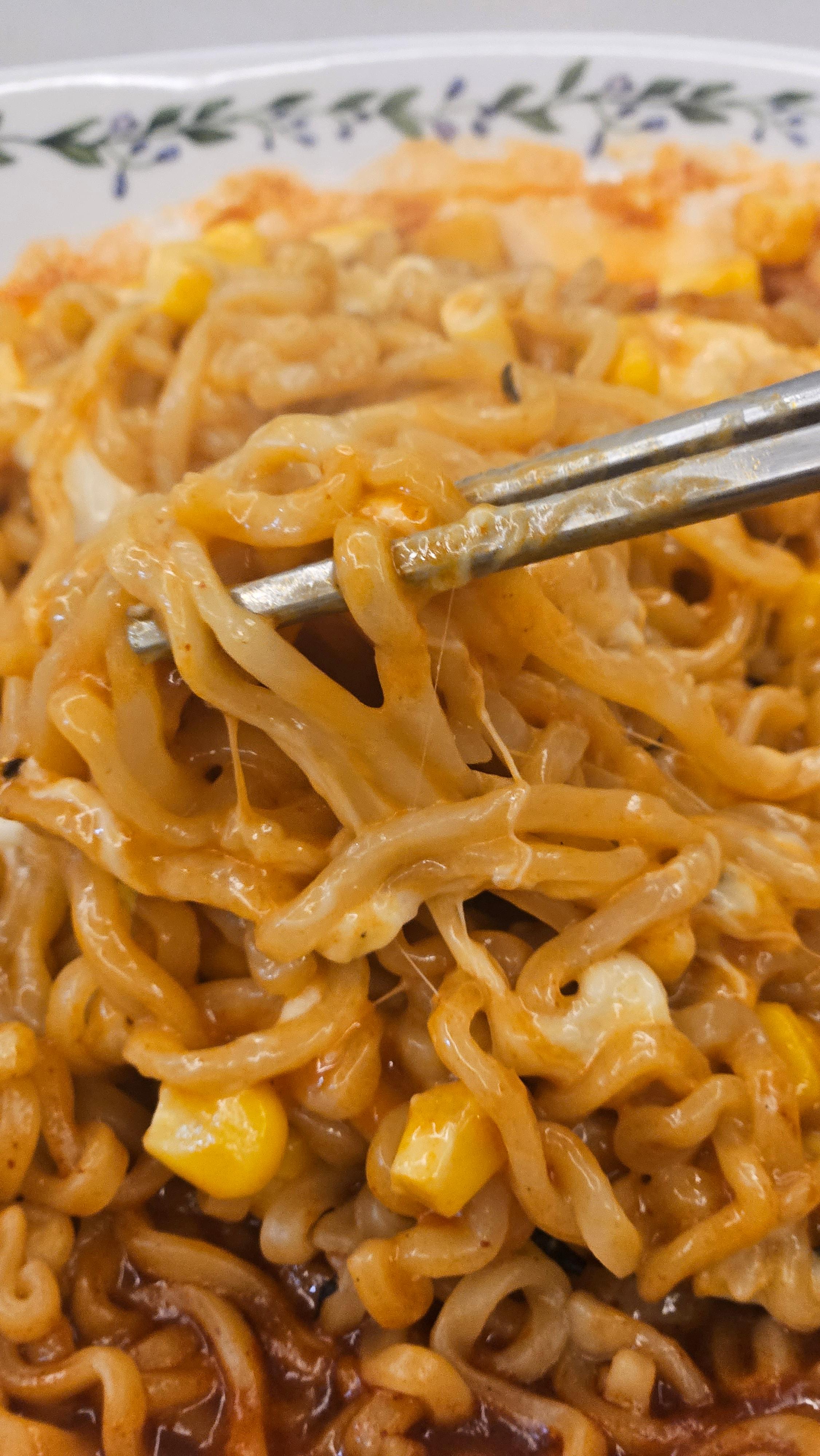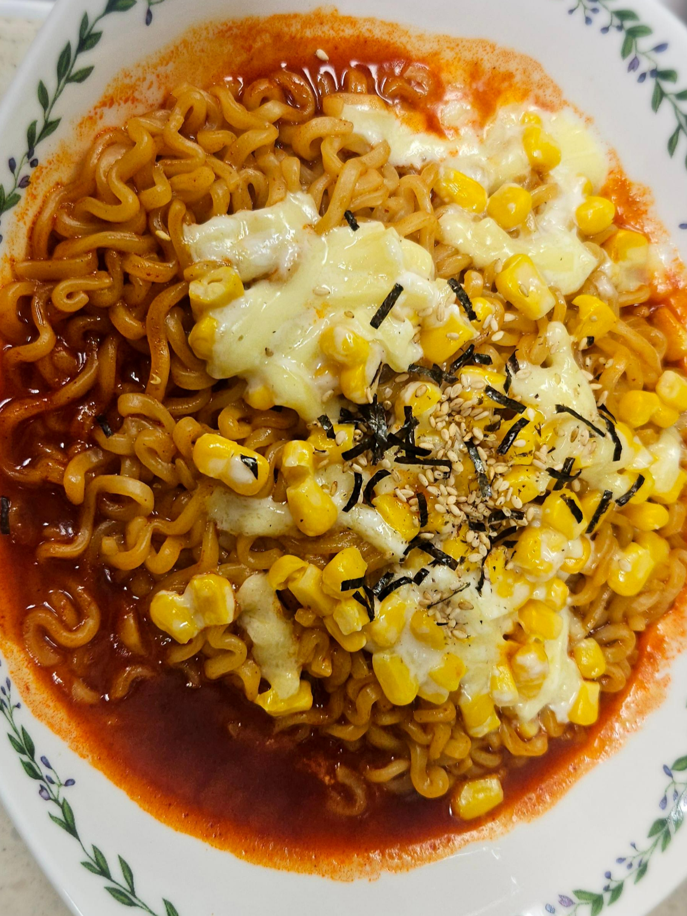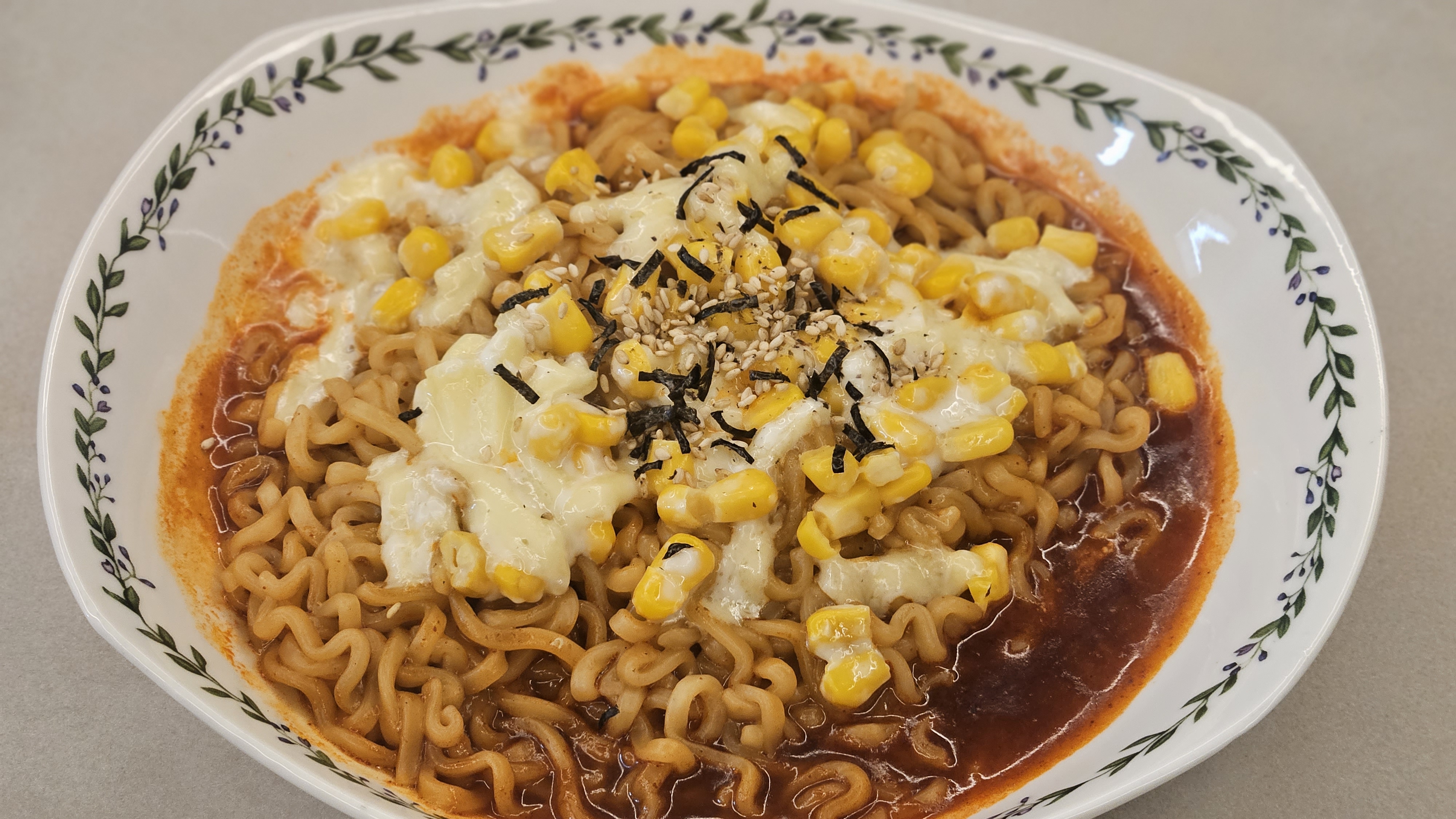 불닭볶음면 1봉, 옥수수콘 2t, 설탕1t, 마요네즈1.5t, 모차렐라 치즈1t